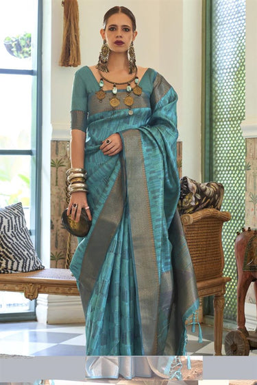 Kalki Koechlin Organza Fabric Cyan Color Excellent Saree
