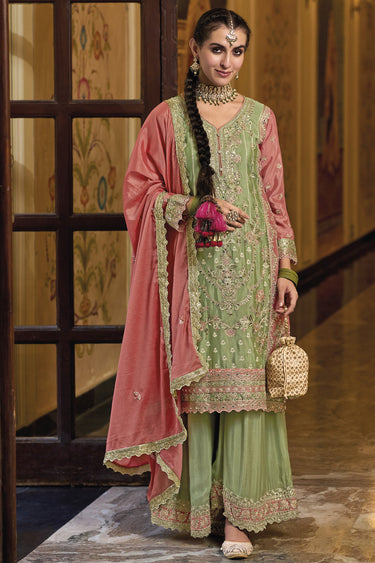 Karva Chauth Special Embroidered Chinon Fabric Sea Green Color Readymade Punjabi Style Palazzo Salwar Kameez