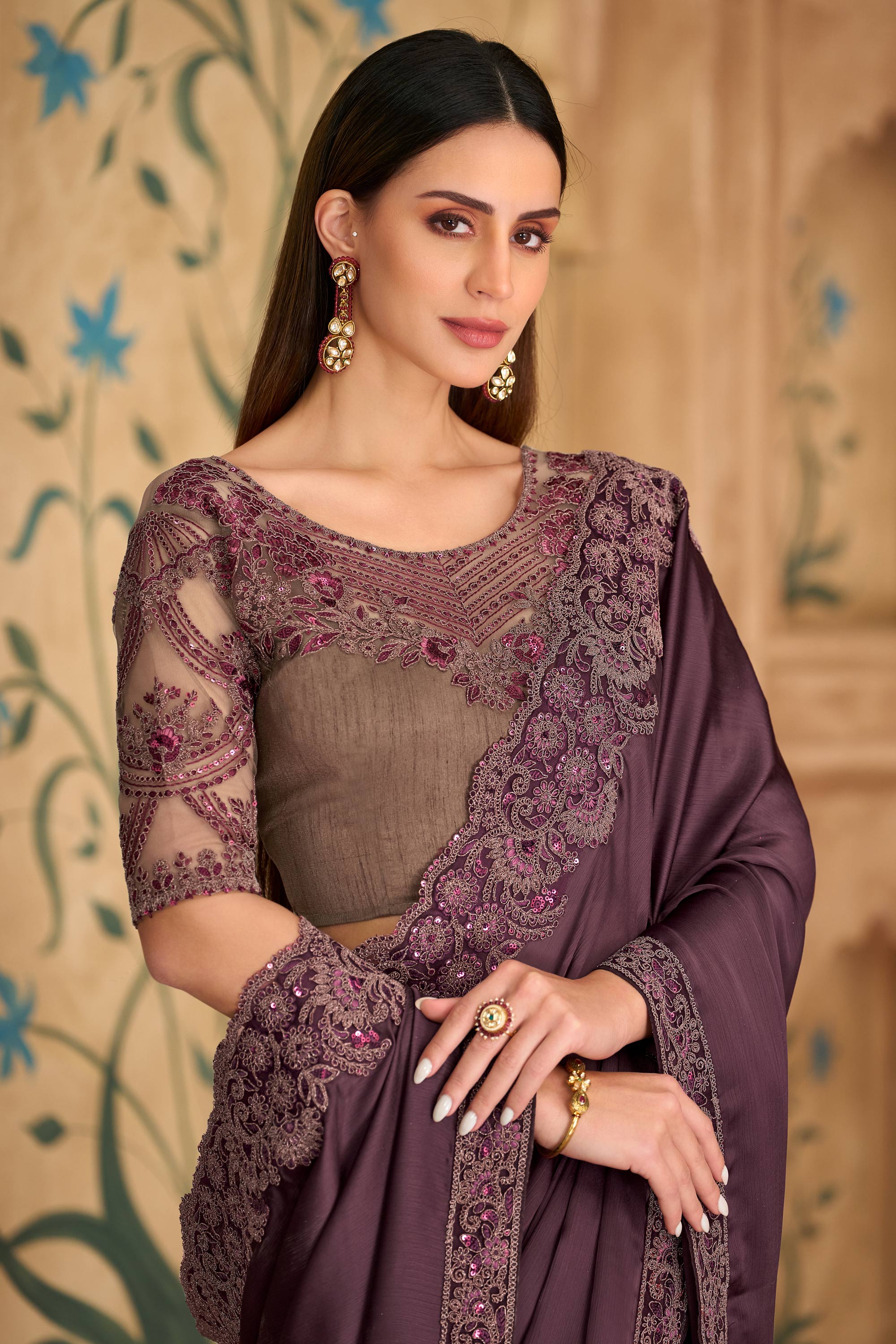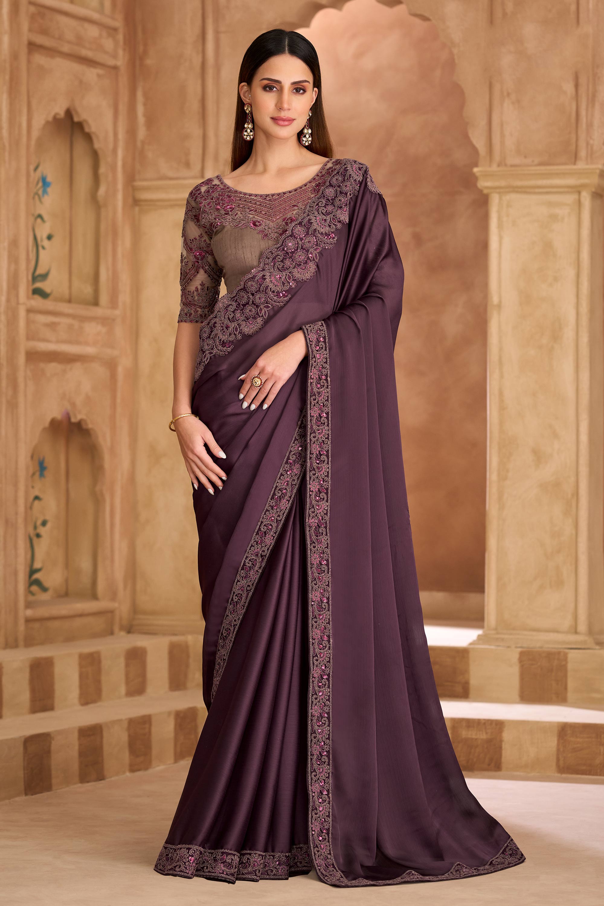 Lace Border Work Satin Chiffon Wine Designer Saree For Festive Wear