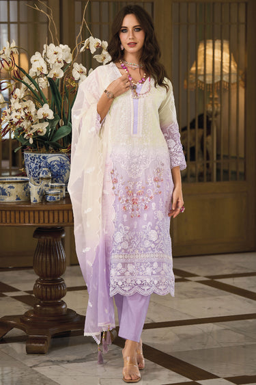 Lavender Color Organza Fabric Fancy Embroidered Readymade Designer Straight Cut Salwar Suit