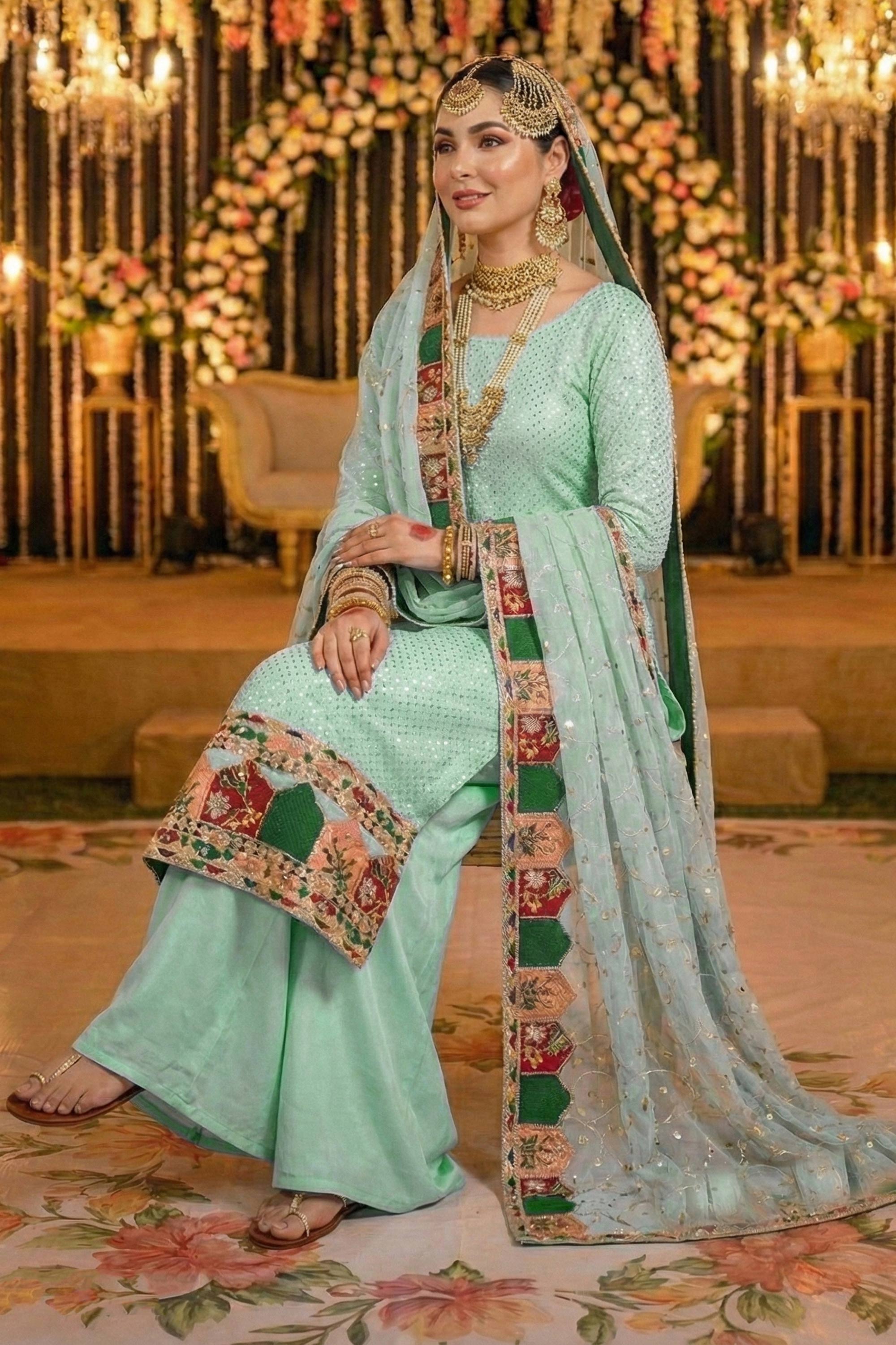 Enhance your ethnic wardrobe with the Light Cyan Georgette Designer Sharara Palazzo Salwar Kameez. Crafted with attention to detail, this outfit showcases delicate patterns and a flowy silhouette, perfect for wedding festivities and cultural events. The breathable georgette material is both lightweight and luxurious, ensuring maximum comfort throughout the day. Featuring stylish sharara palazzo pants, an elegant long kameez, and a beautifully coordinated dupatta, this set exudes grace and poise. Designed to complement all body types, it offers the perfect balance of traditional and modern fashion. Step into any occasion with confidence and flair.