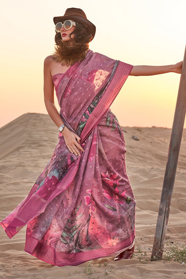 Linen Fabric Pink Color Stylish Look Floral Printed Saree