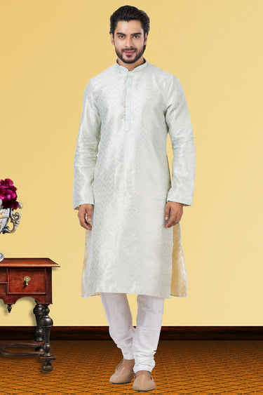 Linen Silk Fabric Attractive Readymade Kurta Pyjama For Men In Light Cyan Color