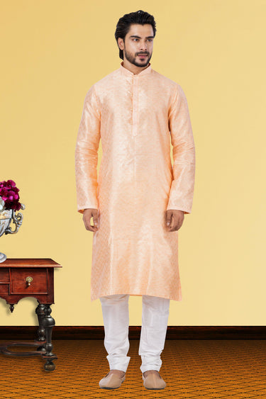 Linen Silk Fabric Peach Festive Wear Readymade Men Stylish Kurta Pyjama
