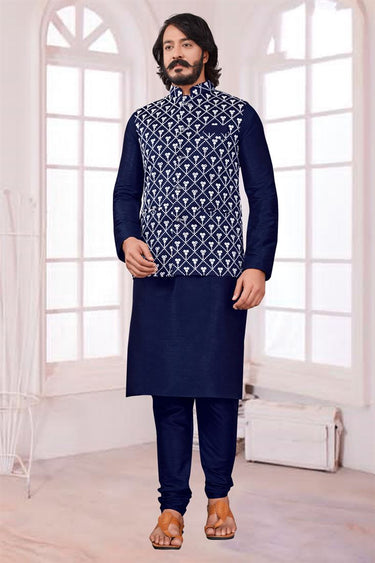 Lovely Blue Color Art Silk Fabric Sangeet Wear Readymade Kurta Pyjama With Designer Jacket