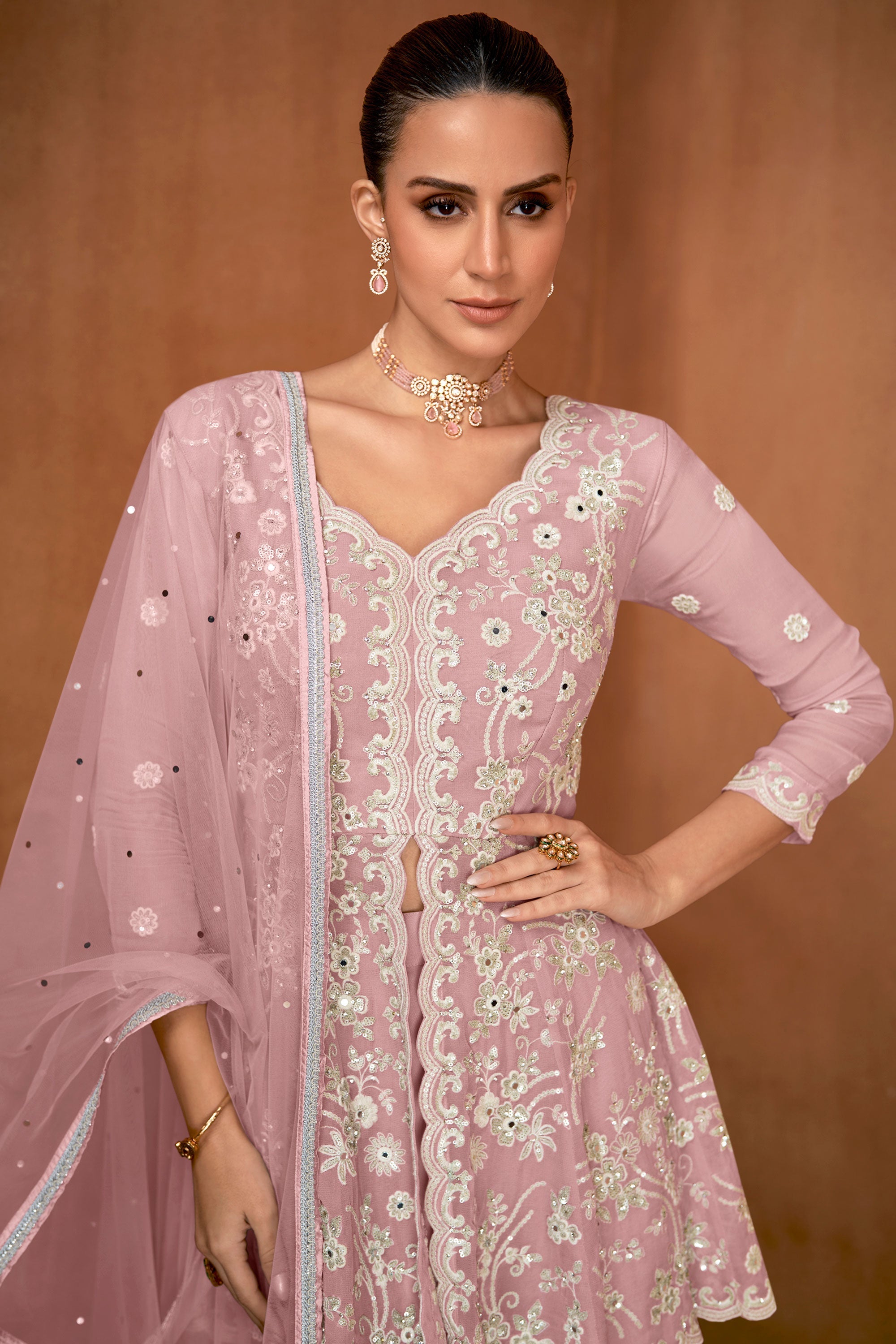Lovely Pink Embroidery Work Readymade Sharara Style Salwar Kameez