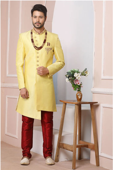 Lovely Yellow Color Banarasi Silk Fabric Wedding Wear Indo Western For Men