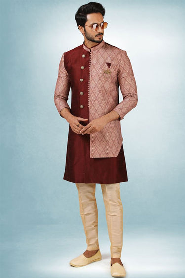Magnificent Art Silk Fabric Maroon Color Wedding Wear Indo Western For Men