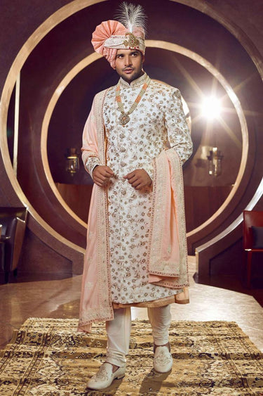 Magnificent White Color Fancy Fabric Heavy Embroidered Designer Indowestern Groom Sherwani