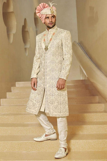 Majestic Cream Color Fancy Fabric Heavy Embroidered Designer Indowestern Groom Sherwani
