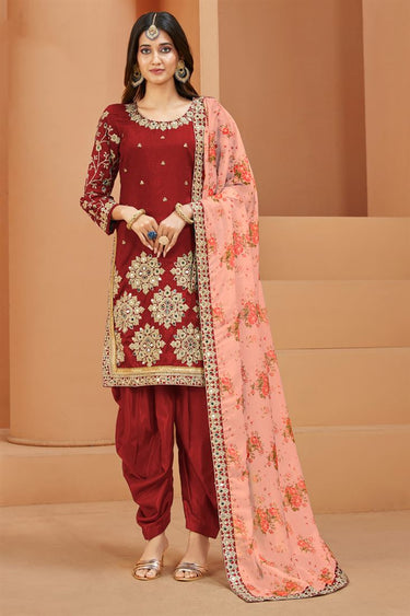 Maroon Art Silk Embroidered Mirror Work Patiala Suit Function Wear