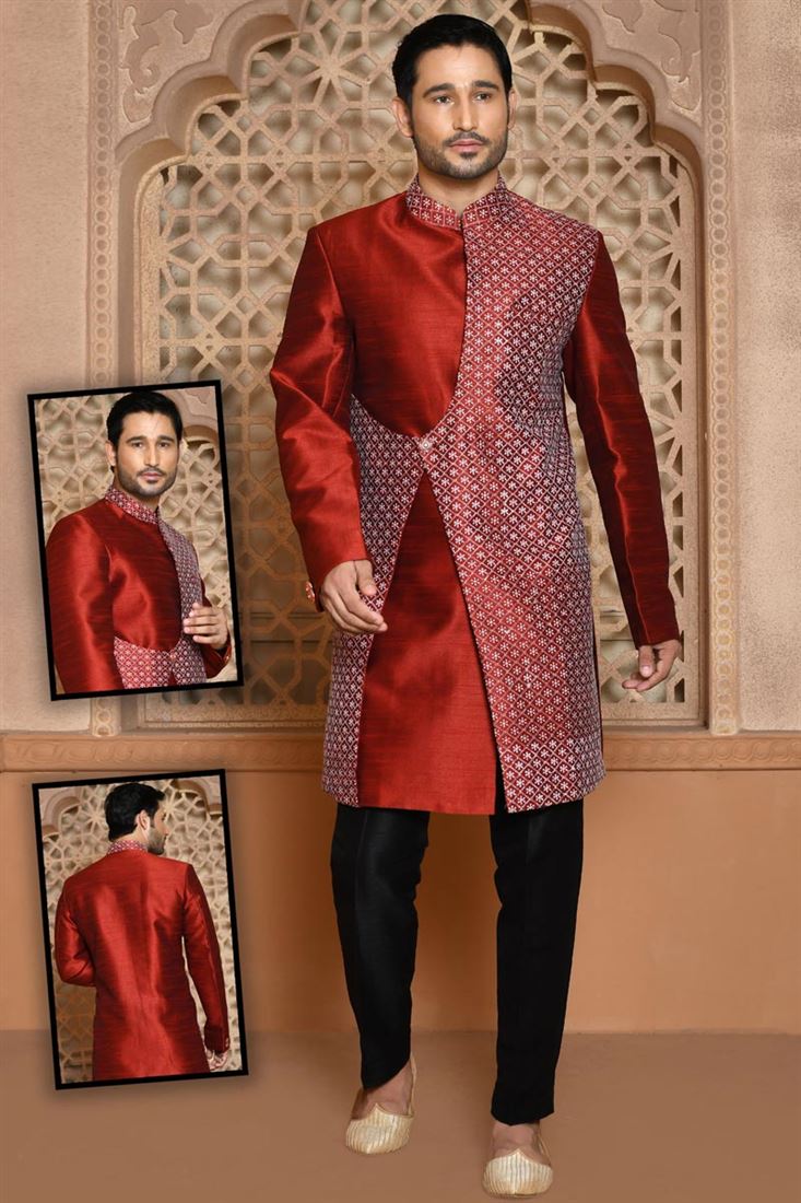 Maroon Color Art Silk Fabric Engrossing Sherwani