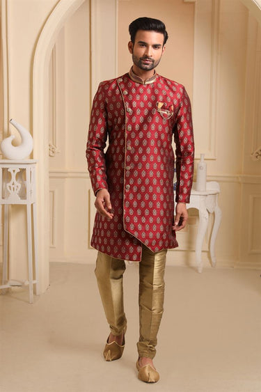 Maroon Color Jacquard Silk Fabric Reception Wear Readymade Indo Western For Men
