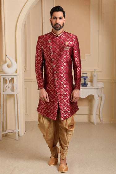 Maroon Color Jacquard Silk Fabric Wedding Wear Readymade Indo Western For Men