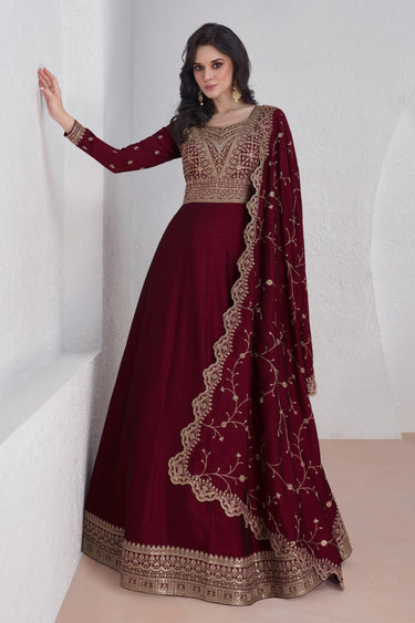 Maroon Color Silk Occasion Wear Embroidery Work Readymade Anarkali Gown With Dupatta