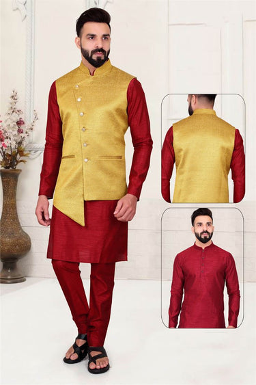 Maroon Kurta Pyjama Jacket Set In Charming Art Silk Fabric