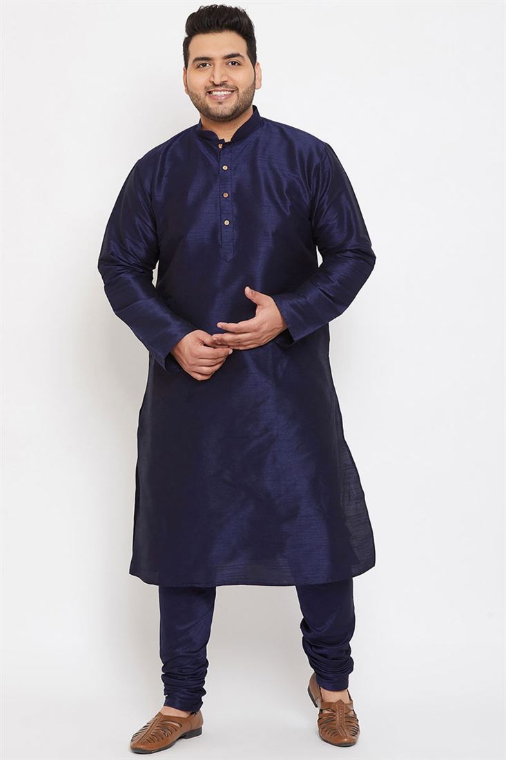 Marvelous Dhupion Silk Fabric Sangeet Wear Plus Size Kurta Pyjama In Navy Blue Color