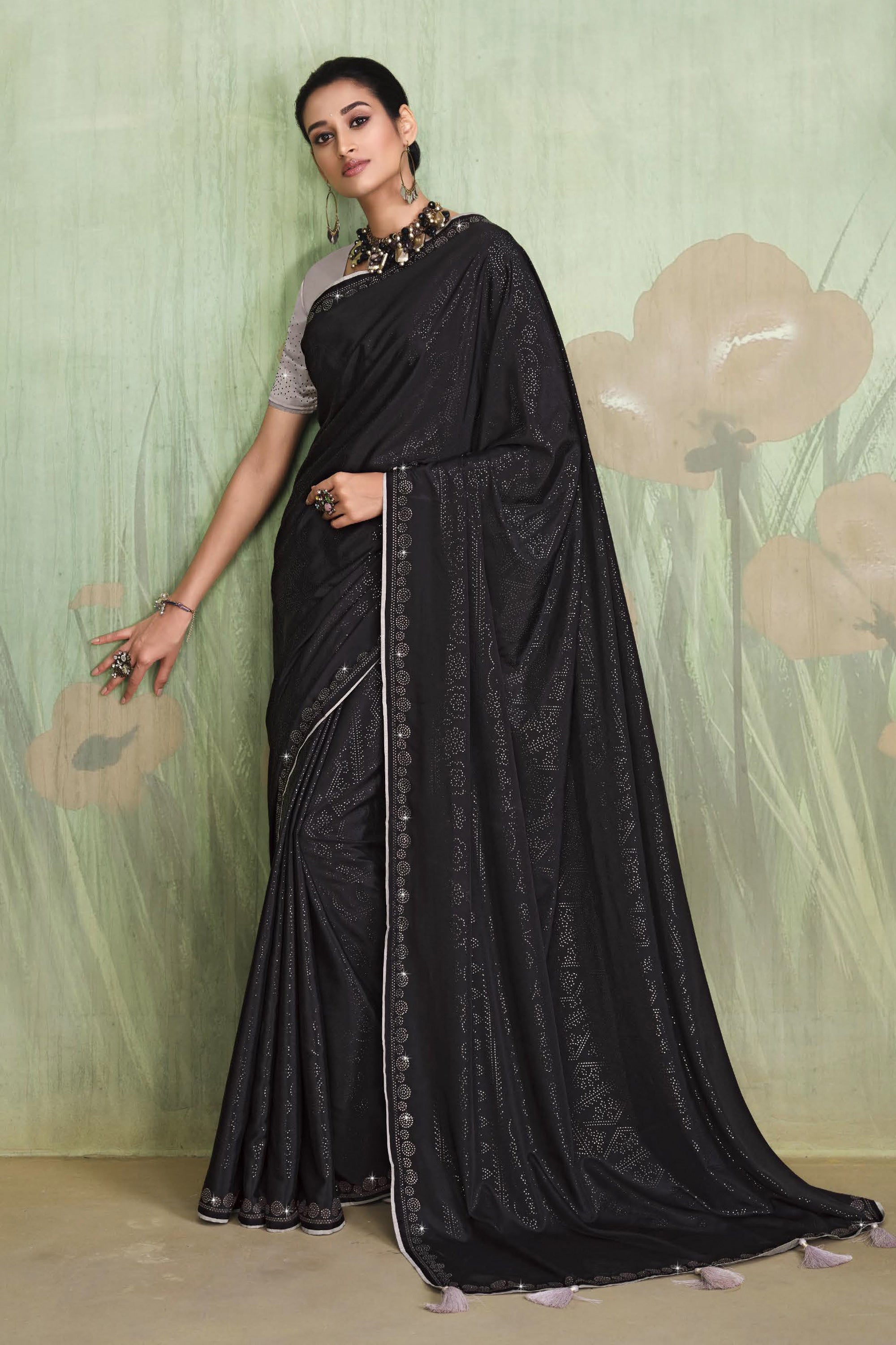 Marvelous Satin Crepe Black Color Saree With Contrast Blouse
