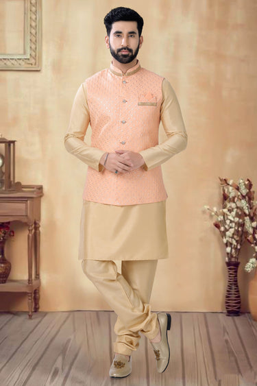 Elevate your traditional style with this exquisite Reception Wear Kurta Pyjama Set for Men. Crafted from luxurious cream-colored Art Silk fabric, this readymade set includes a beautifully designed kurta, matching pyjama, and a 3-piece jacket set that exudes sophistication. Perfect for weddings, receptions, or festive celebrations, this ensemble ensures you make a stylish statement. The fine craftsmanship and intricate detailing of the jacket add a touch of elegance, while the comfortable fit keeps you at ease. Experience timeless fashion with this must-have ethnic outfit.