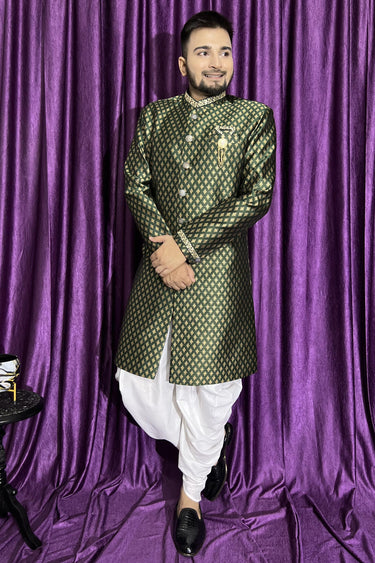Men Green Color Wedding Wear Designer Readymade Peshawari Style Indo Western
