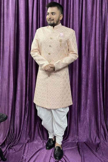 Mens Wedding Function Readymade Peach Color Peshawari Style Indo Western In Silk Fabric