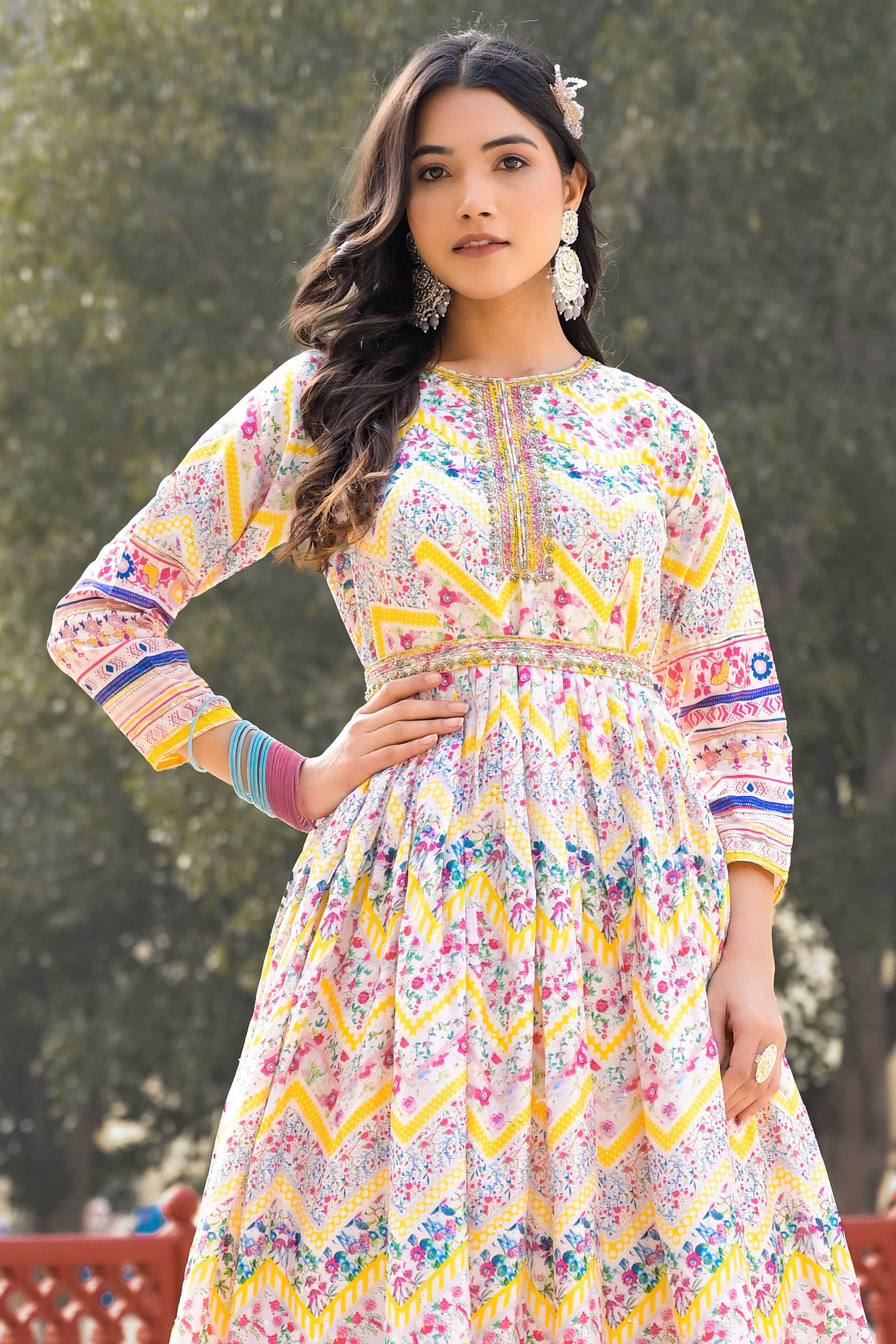 Merlot Dola Silk Fabric Off White Color Printed Readymade Gown With Dupatta