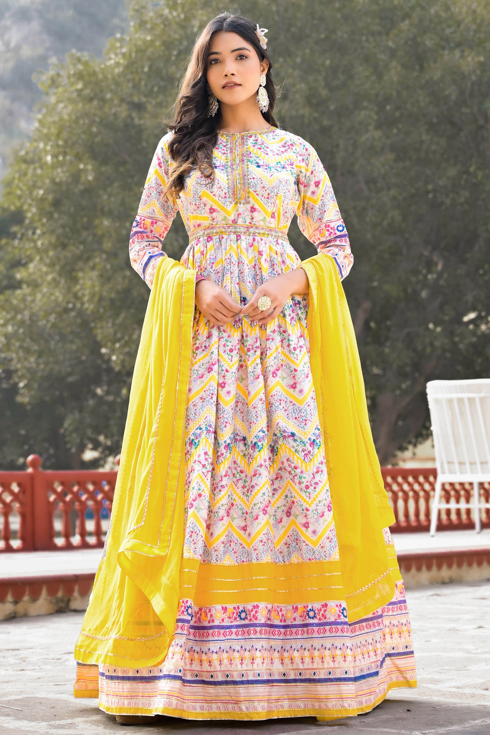 Feel and look ethereal with our Albescent Dola Silk Printed Readymade Gown with Dupatta! Made with soft, dola silk, this stunning readymade gown has been designed for style and comfort, suitable for all your party needs. Comes complete with a matching dupatta, further enhancing its overall appeal. Perfect for turning heads and stealing the spotlight, wherever you go.