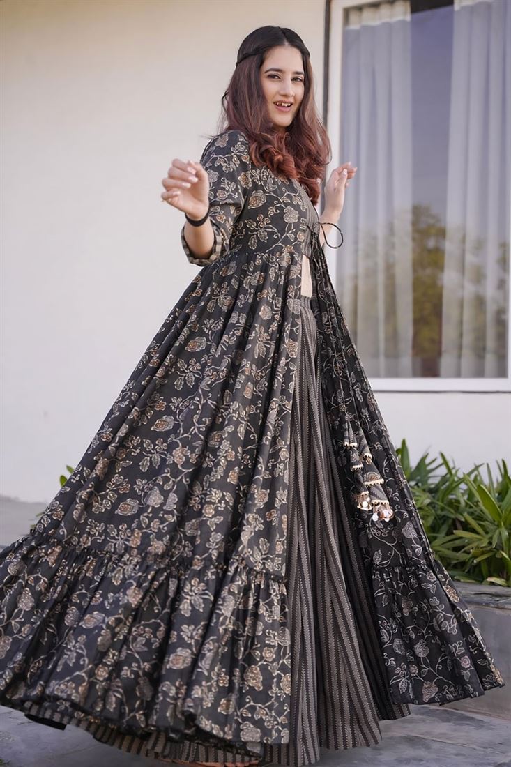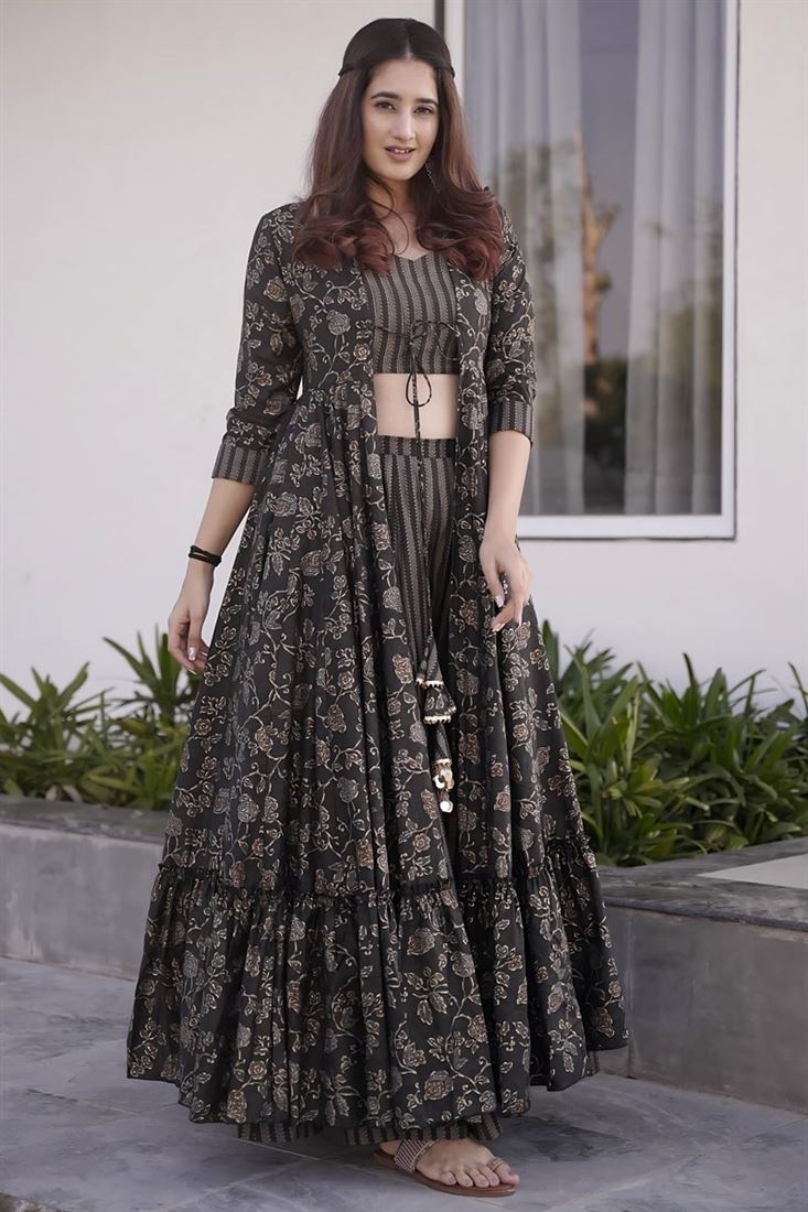 Muslin Fabric 3 Piece Koti Style Indo Western Suit In Black Color