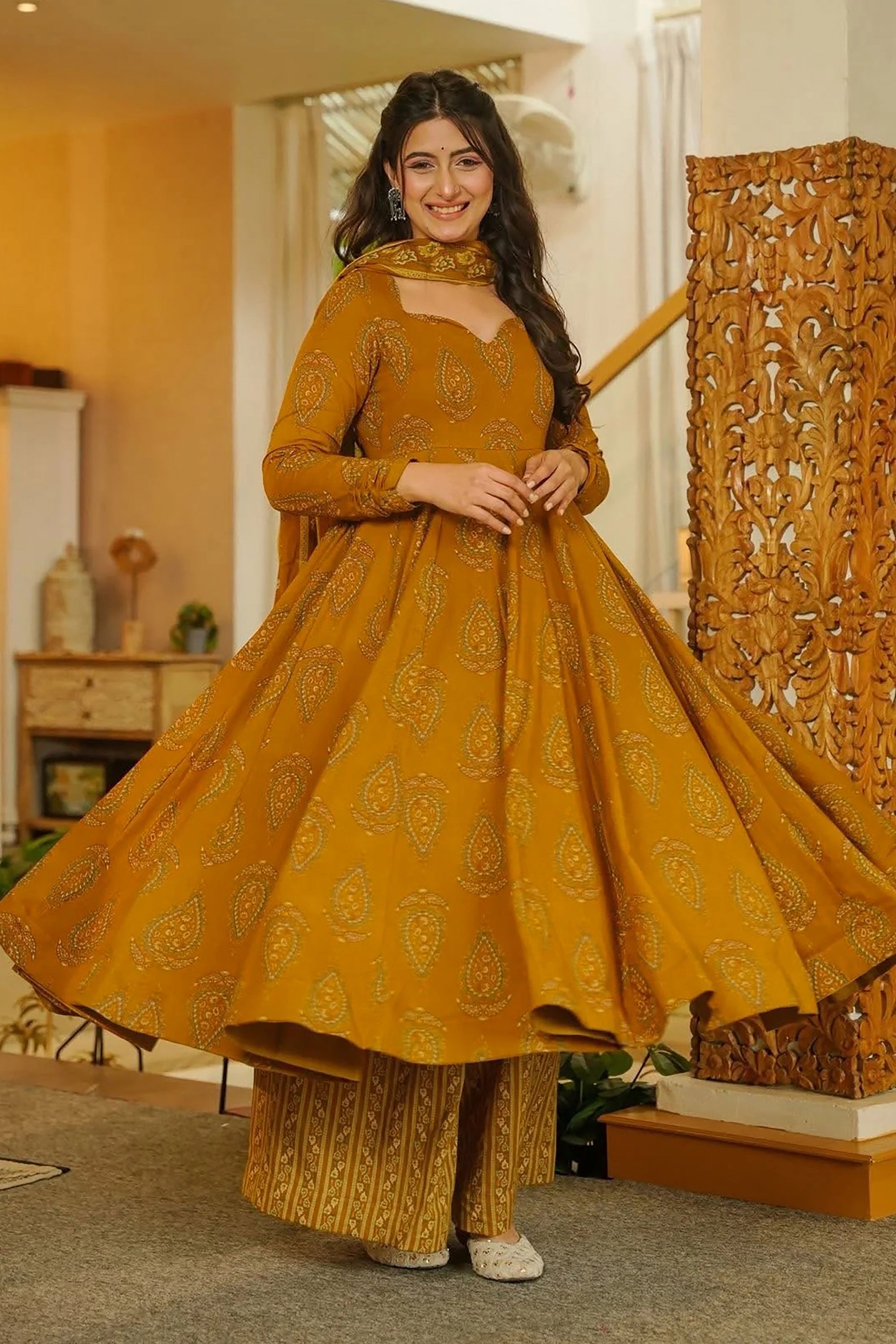 Muslin Printed Mustard Stylish Readymade Anarkali Style Salwar Kameez