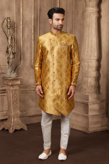 Mustard Color Jacquard Silk Fabric Reception Wear Readymade Indo Western For Men