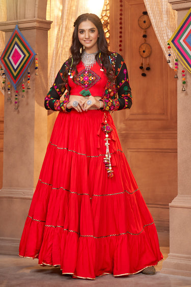 Navratri Special Embroidered Work On Red Color Embellished Viscose Rayon Fabric Lehenga Choli