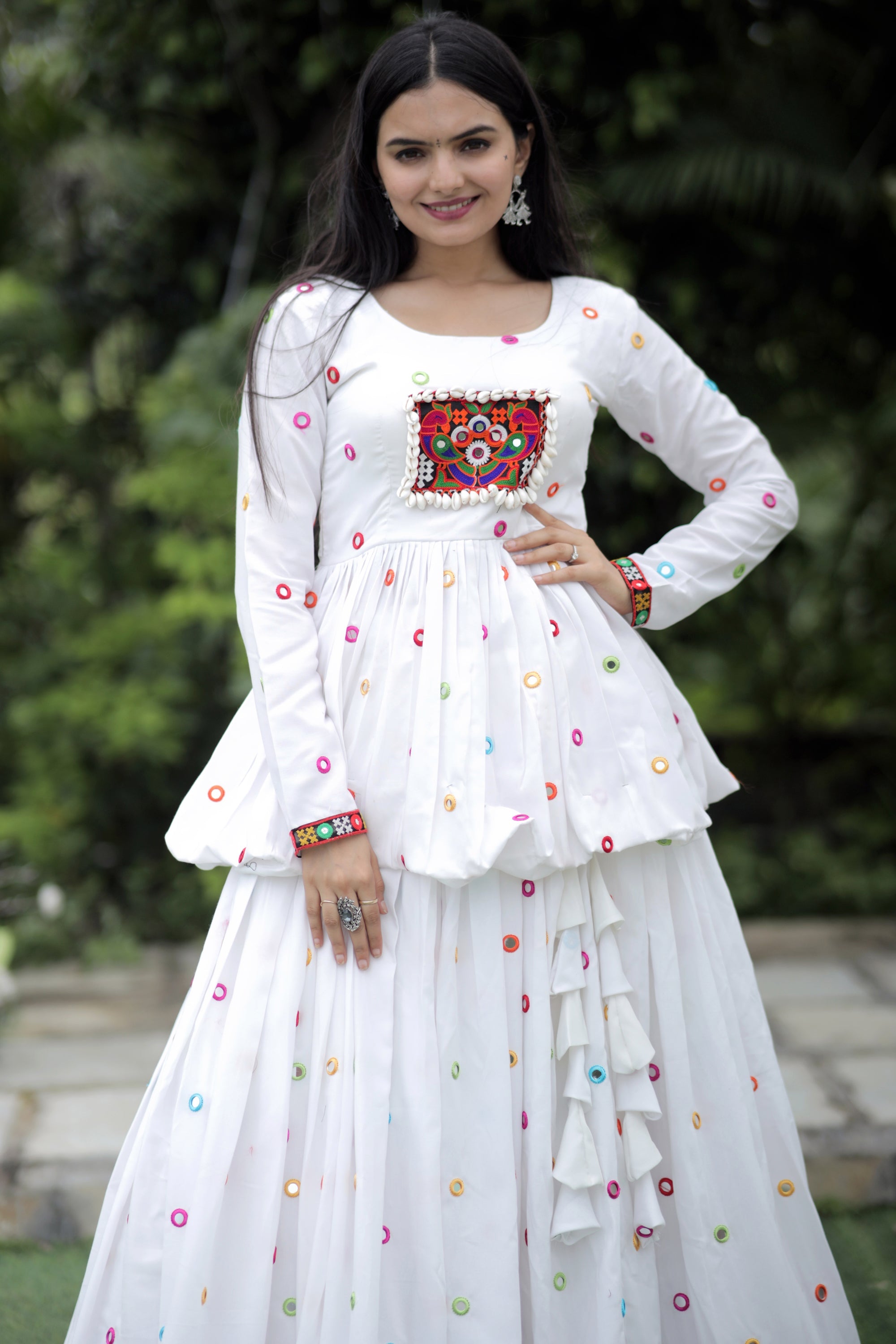 Navratri Special Mirror Work White Color Rayon Fabric Beatific Readymade Lehenga Choli