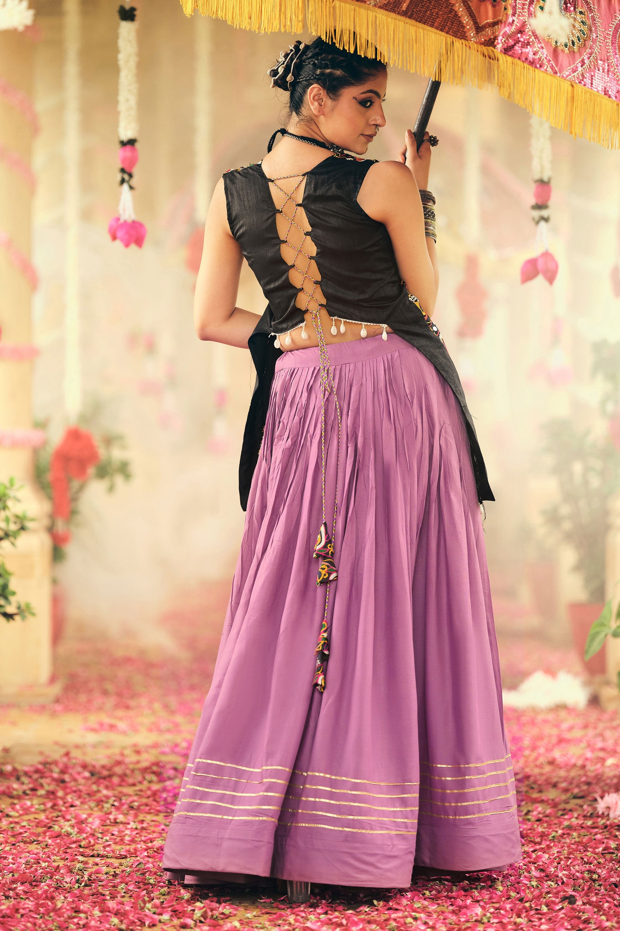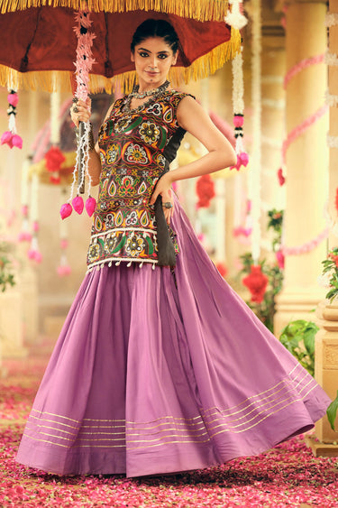 Navratri Speciall Purple Embroidered Kodi Lace Border Top With Skirt