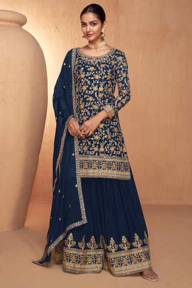 Navy Blue Color Exquisite Palazzo Suit In Chinon Fabric
