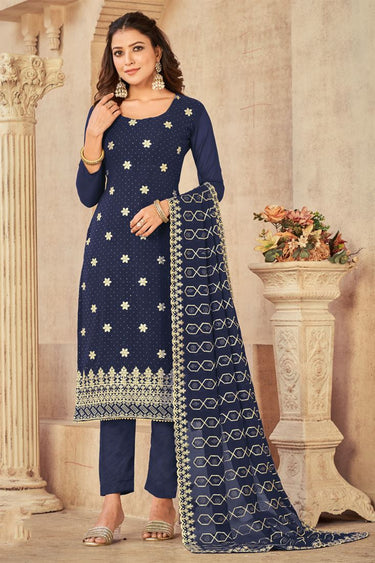 Introducing our exquisite Navy Blue Salwar Suit in captivating Georgette fabric, featuring intricate embroidery work. This stunning ensemble is designed to make you stand out at any occasion, be it weddings, parties, or festive celebrations.