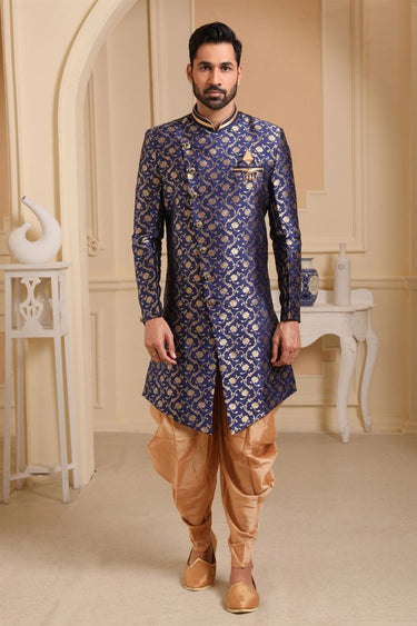 Navy Blue Color Jacquard Silk Sangeet Wear Readymade Indo Western For Men