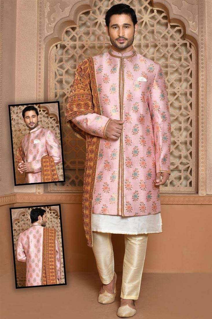 Navy Blue Color Stunning Wedding Wear Banarasi Silk Sherwani
