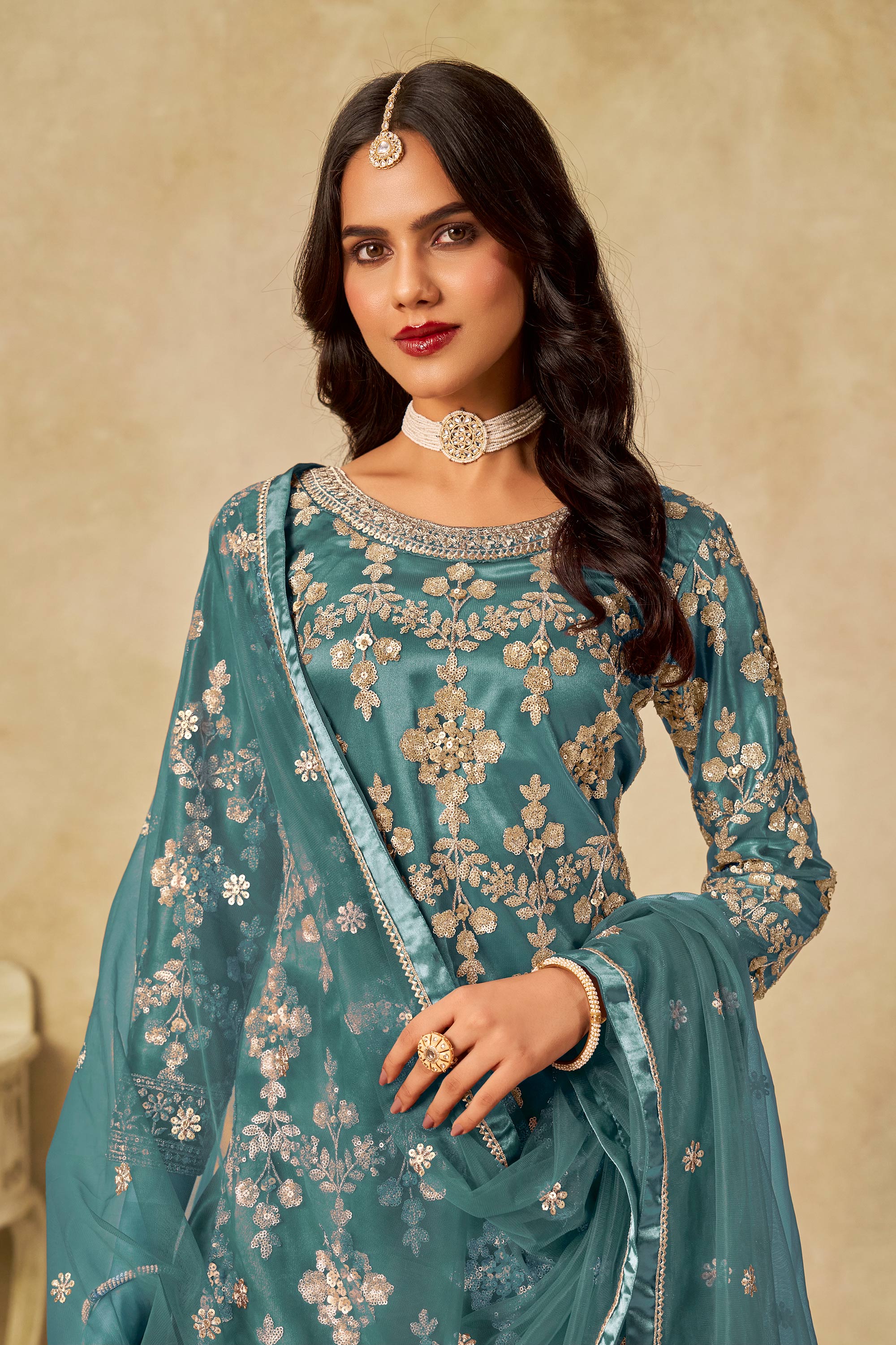 Step into style and grace with this Net Designer Sharara Palazzo Salwar Kameez, a perfect addition to your ethnic wardrobe. This ensemble boasts intricate embroidery on soft net fabric, offering a sophisticated and trendy look for weddings, festivals, and celebrations. The lightweight palazzo and flattering sharara cut enhance comfort while maintaining a modern yet traditional vibe. Its fine detailing reflects artistry, making you stand out at every event. Pair it with statement jewelry and heels to complete your outfit effortlessly. Choose this for unmatched elegance and comfort.