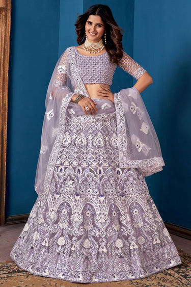 Net Fabric 3 Piece Lehenga Choli In Lavender Color With Embroidery Work