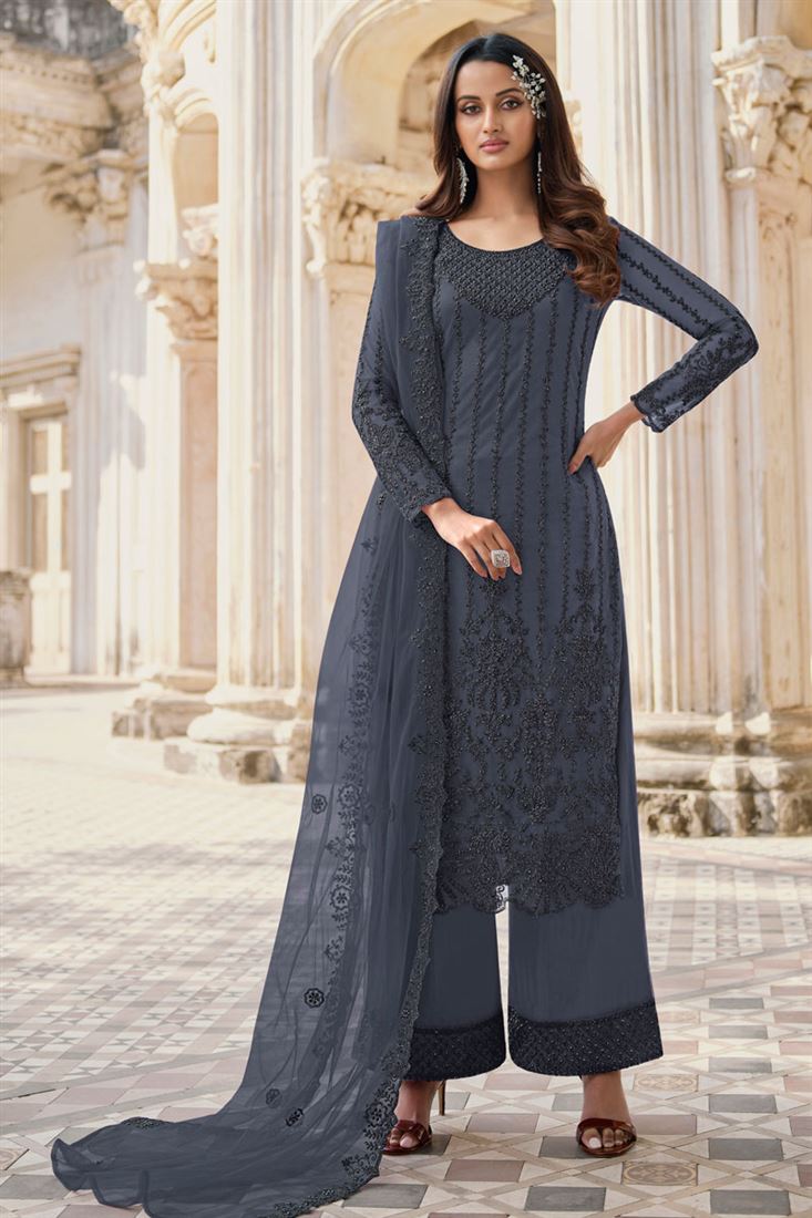 Net Fabric Grey Color Fantastic Salwar Suit With Embroidered Work
