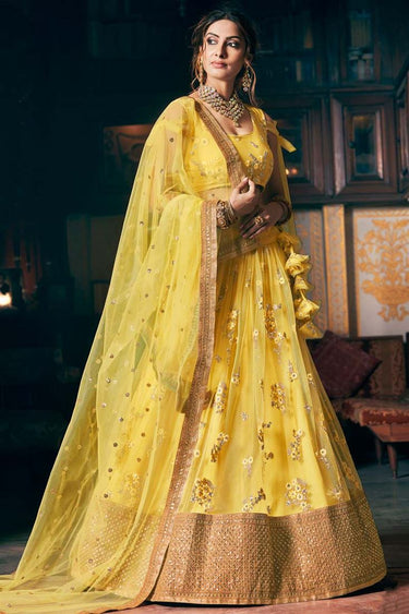 Net Fabric Yellow Color Lavish Sangeet Wear Embroidered Work Lehenga