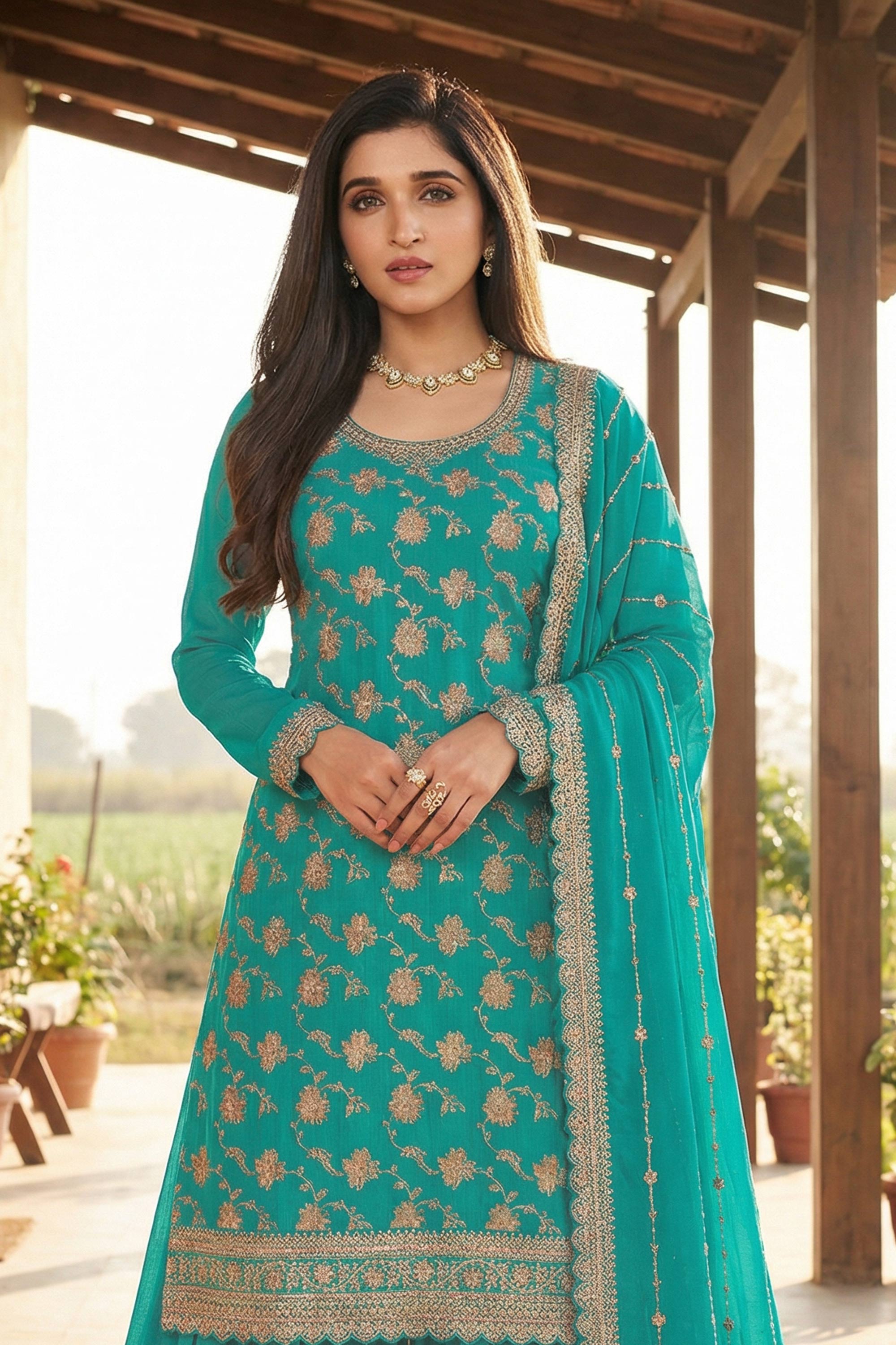 Nidhi Shah Chinon Fabric Embroidered Teal Readymade Palazzo Salwar Kameez