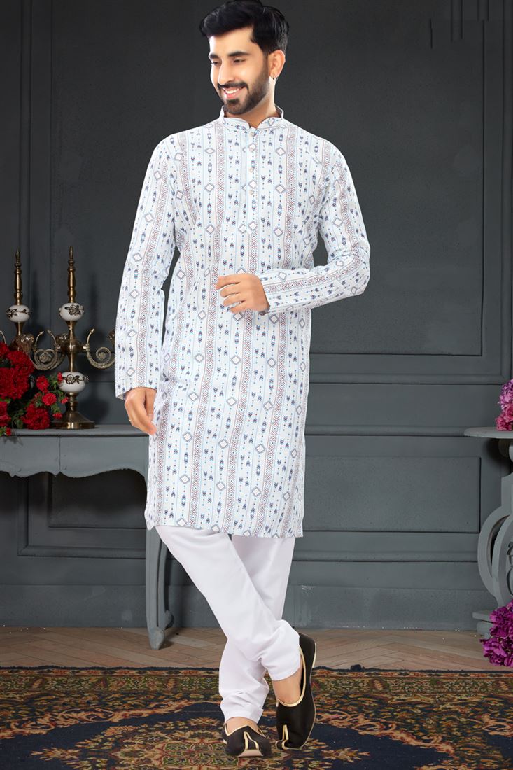 Off White Digital Printed Kurta Pyjama In Silk Fabric