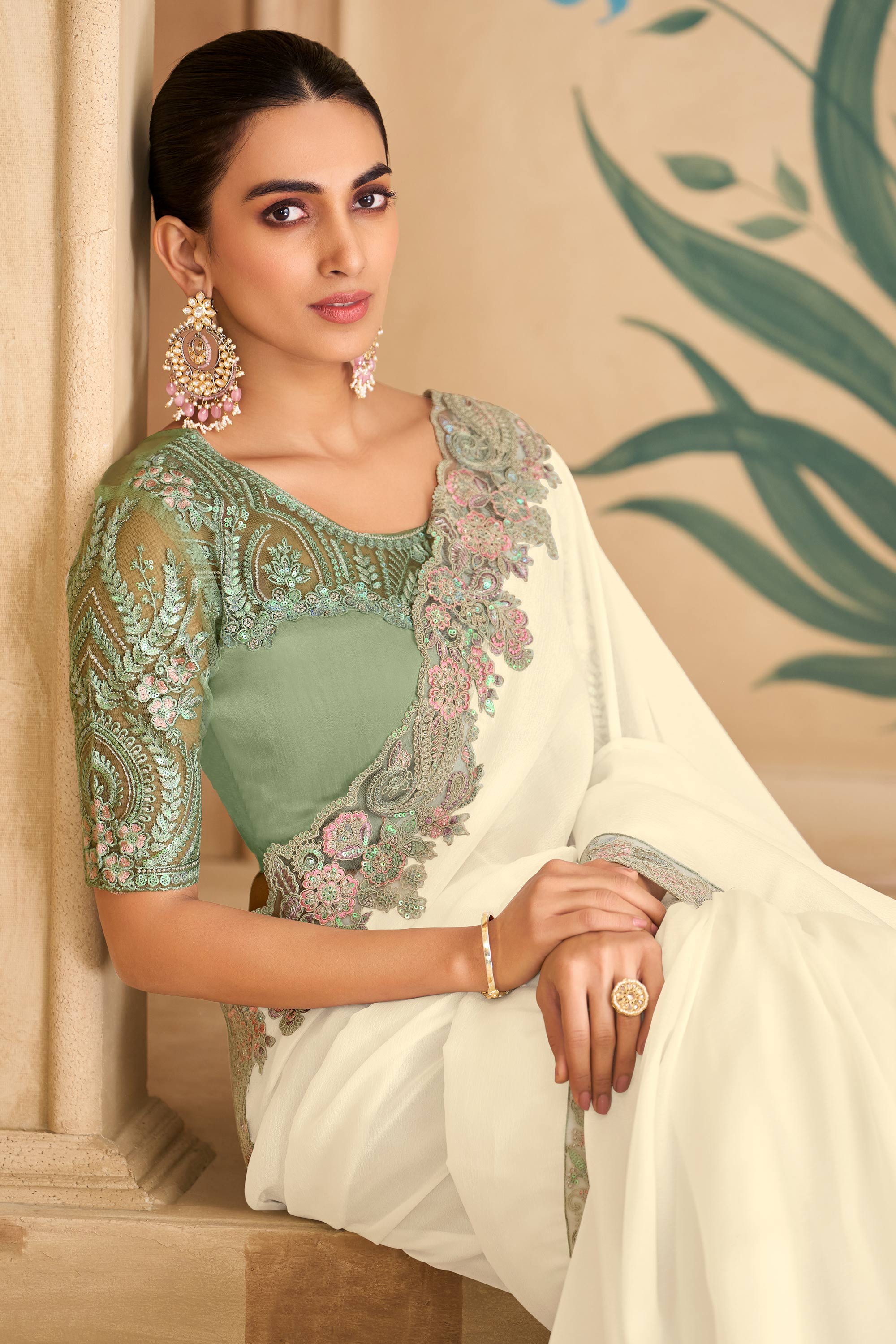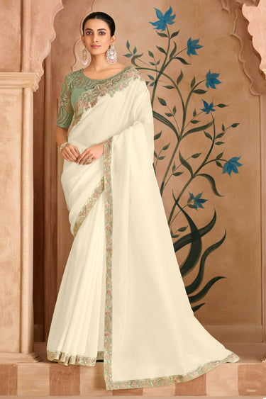 Off White Festive Wear Satin Chiffon Lace Border Work Designer Saree
