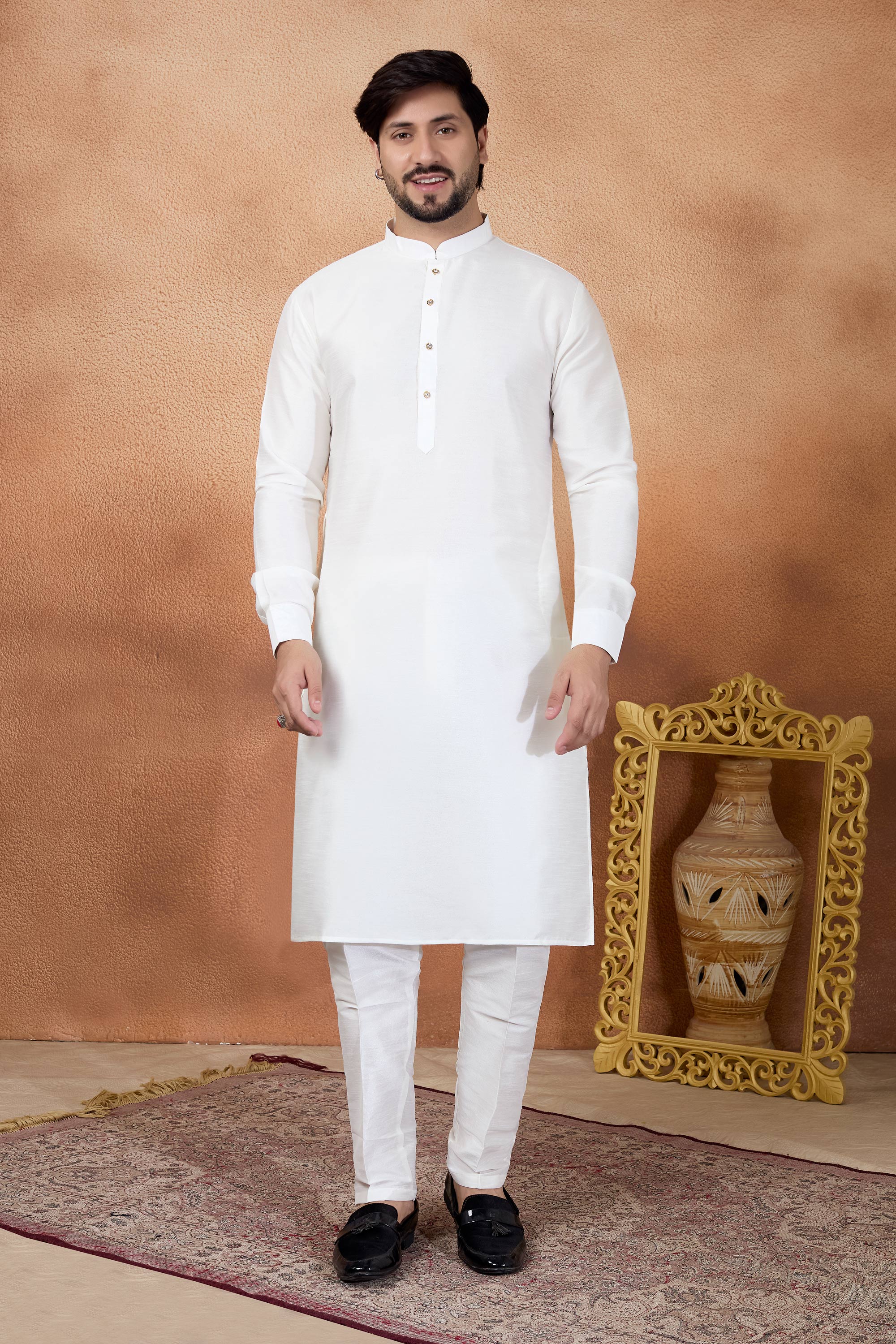 Off White Function Wear Art Silk Readymade Kurta Pyjama For Men