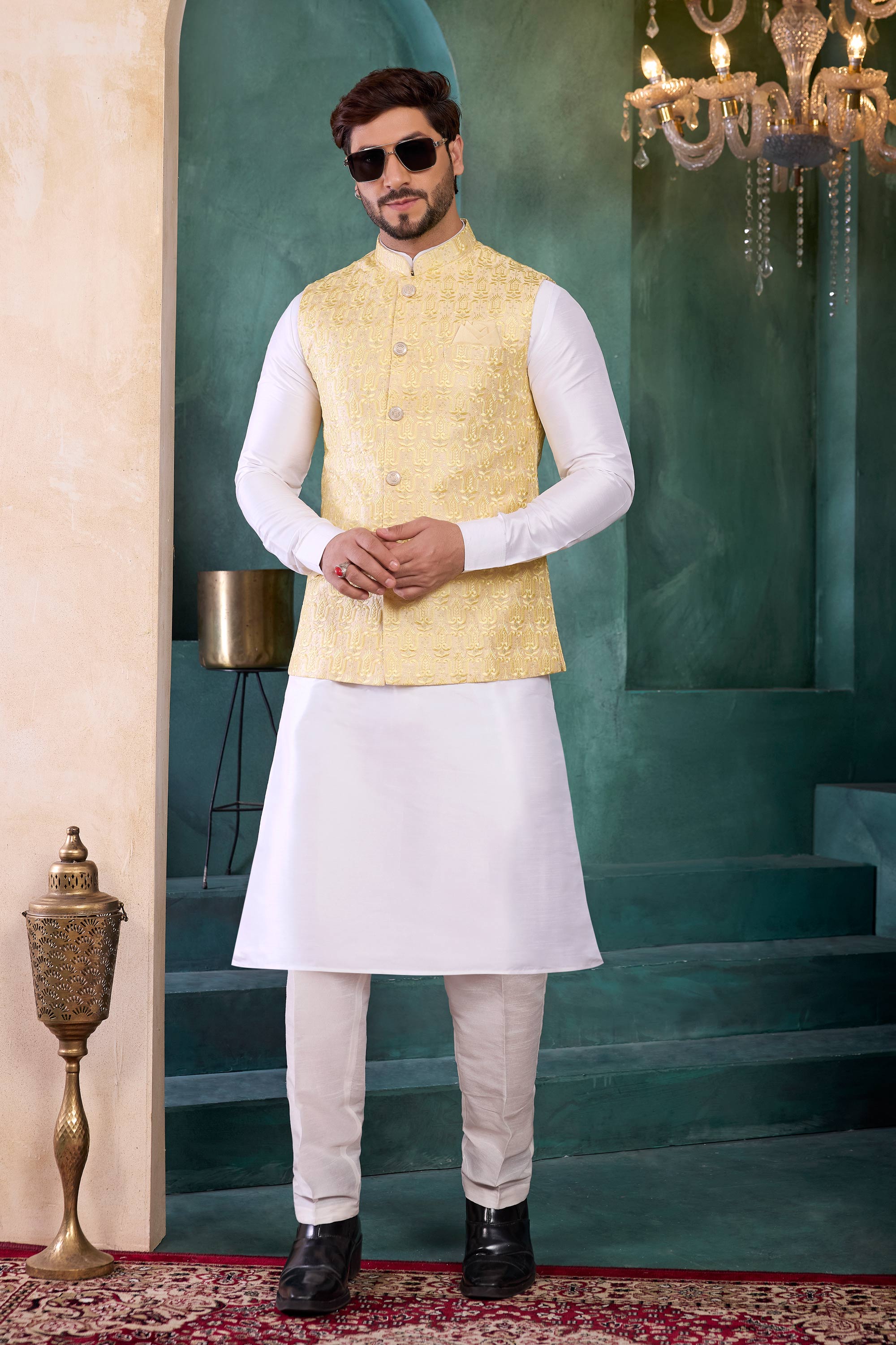 Celebrate special moments with this mens readymade 3-piece kurta, jacket, and Aligadhi pants set. Featuring a contemporary design rooted in tradition, this outfit is crafted to suit weddings, family gatherings, and formal events. The kurta and jacket feature unique designer patterns that make them an effortless choice for festive style, while the Aligadhi pants ensure an excellent fit and lasting comfort. Made with breathable fabric, this set is ideal for day-long wear during joyful occasions. Make a confident and striking statement at every function with this ready-to-wear ethnic ensemble.