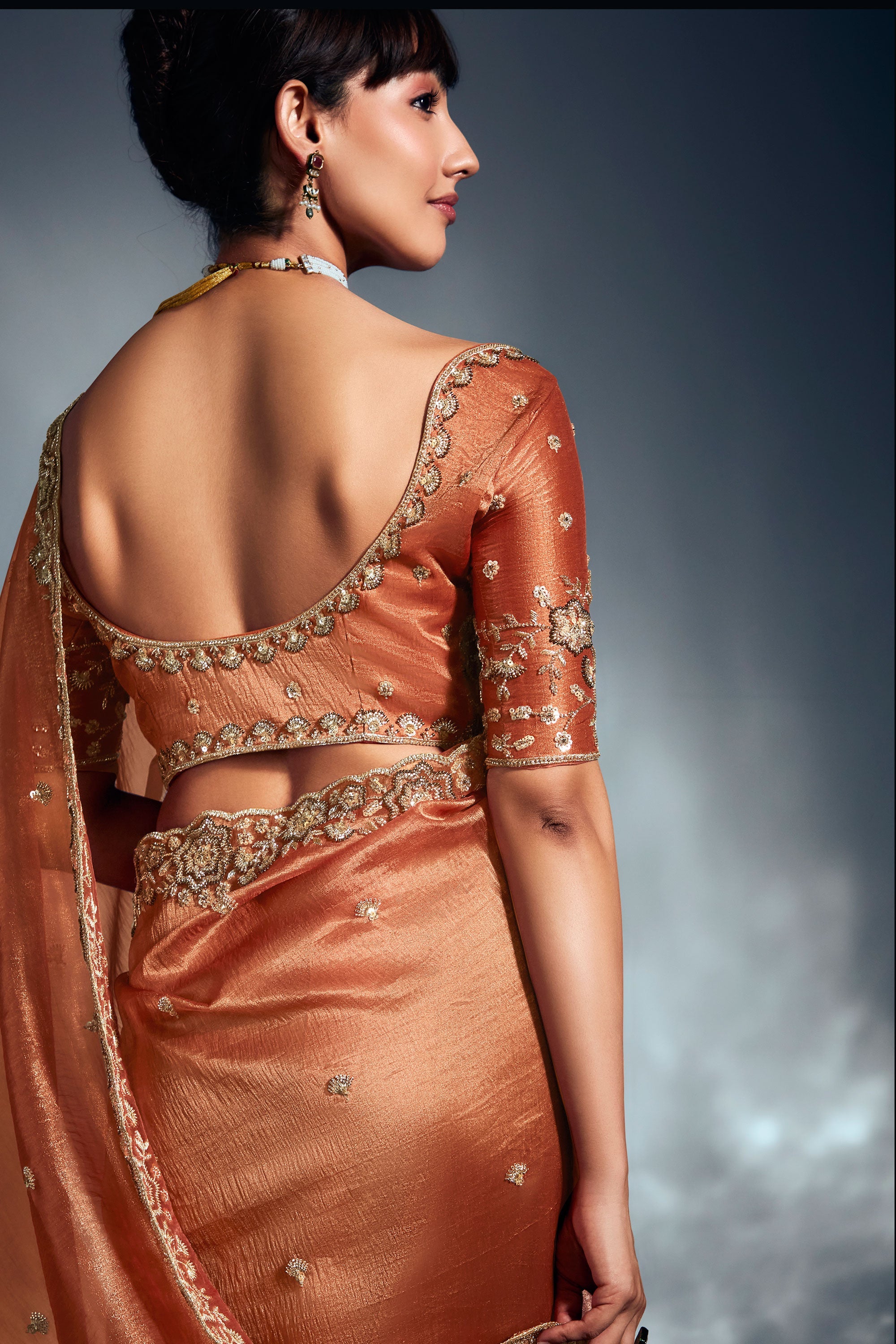 Orange Color Organza Fabric Coveted Saree With Fancy Heavy Work
