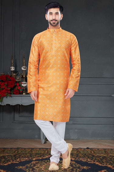 Orange Color Printed Mens Kurta Pyjama In Silk Fabric