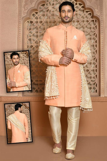 Orange Color Vivacious Banarasi Silk Sherwani In Wedding Wear