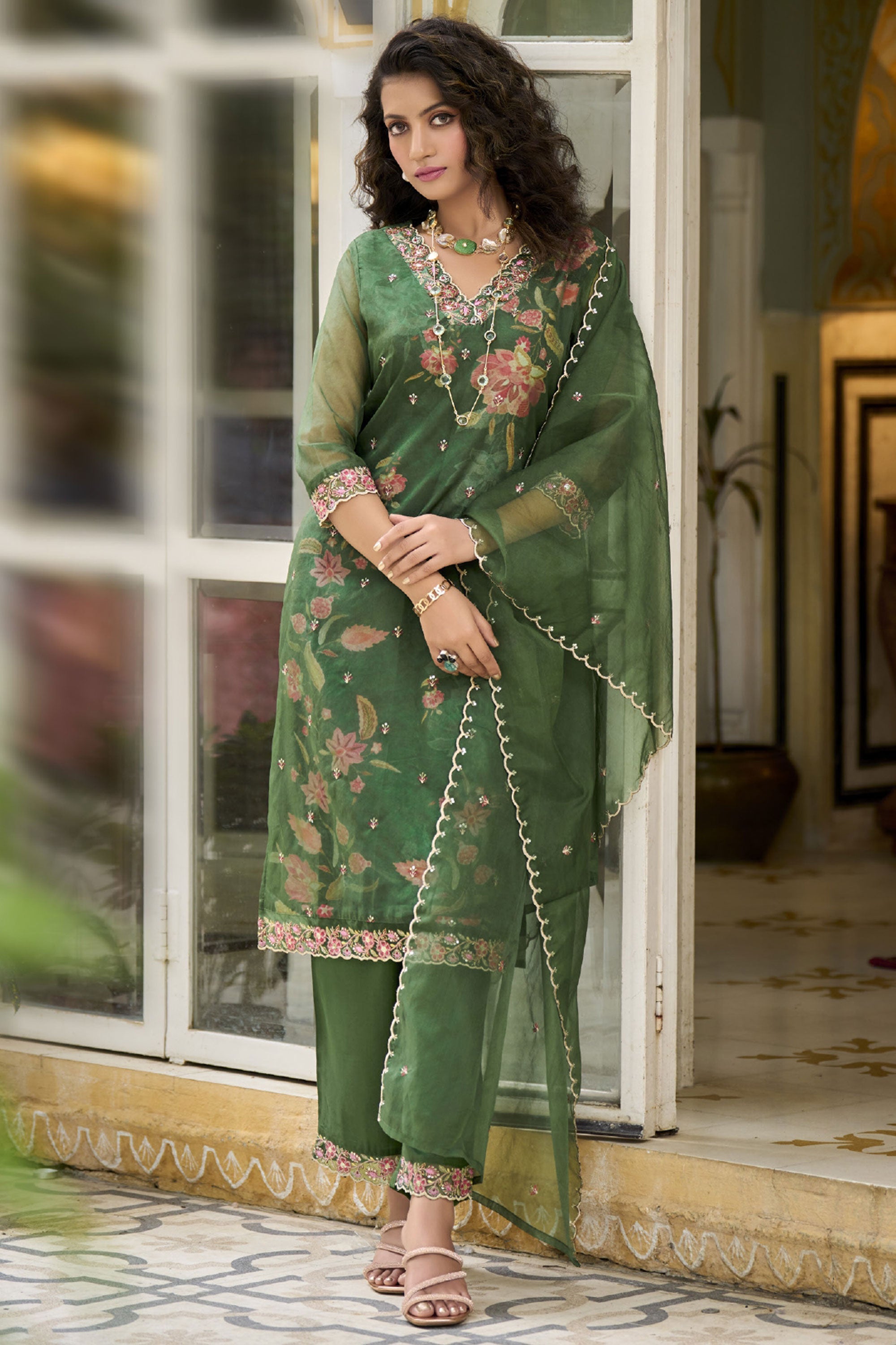 Organza Fabric Embroidered Function Wear Readymade Straight Cut Salwar Kameez In Green Color